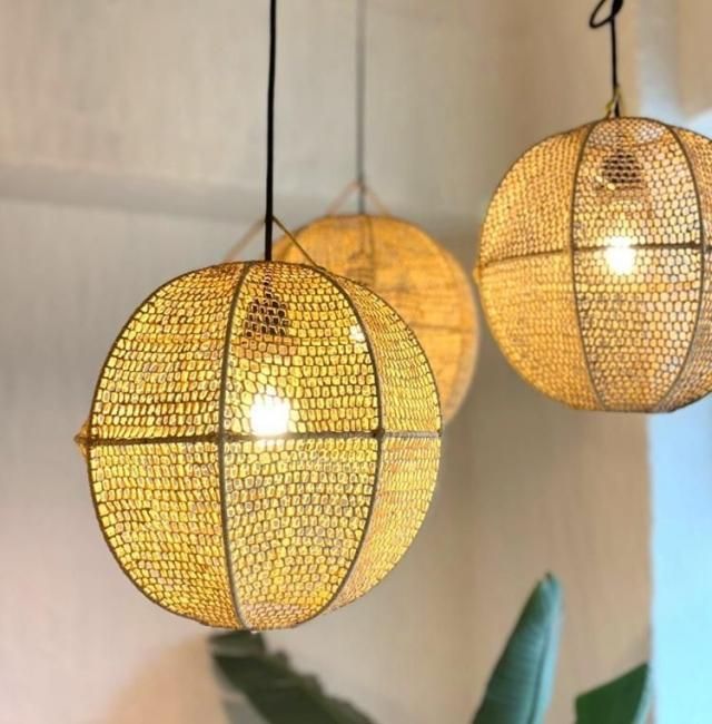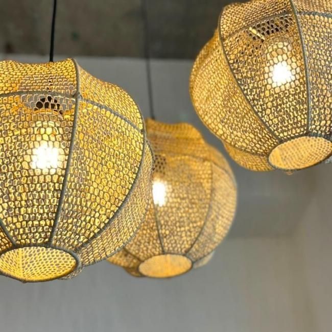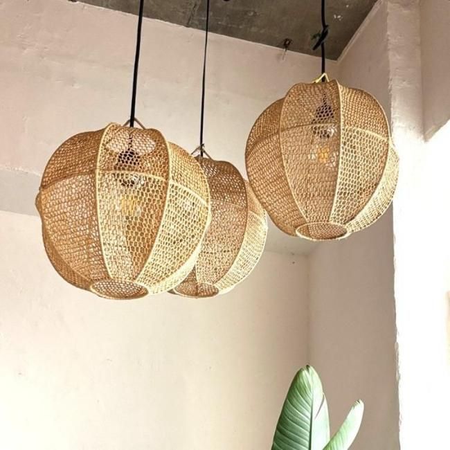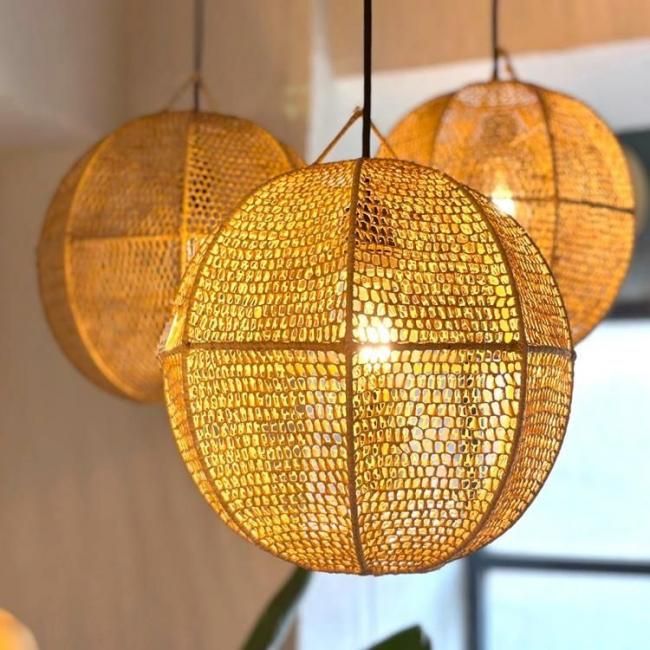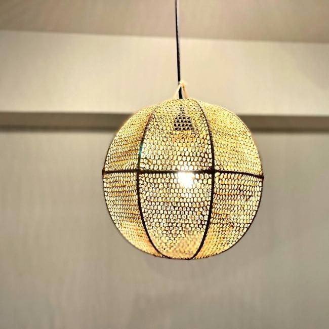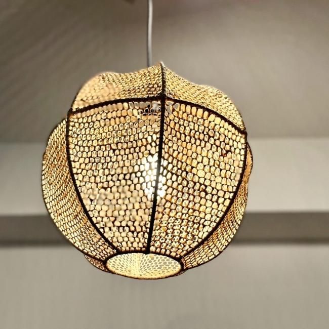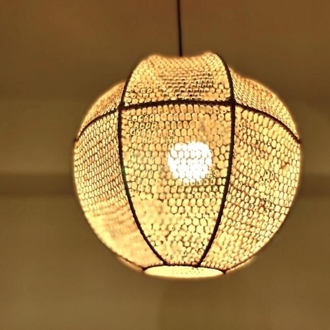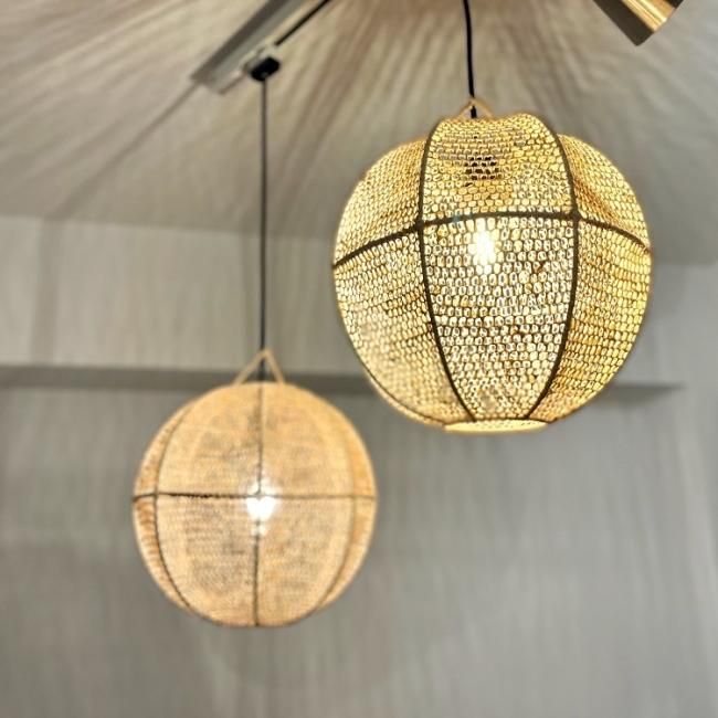 天然素材のラフィアを編み込んでつくられたハンドメイドのランプシェードです。