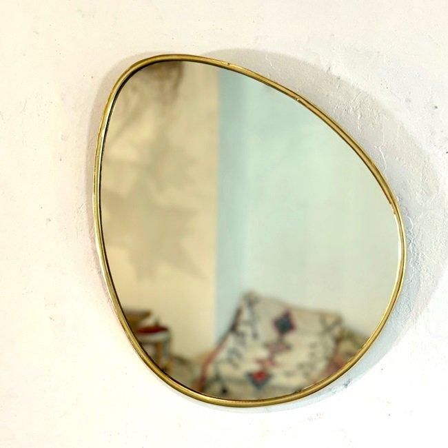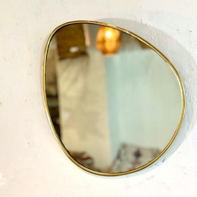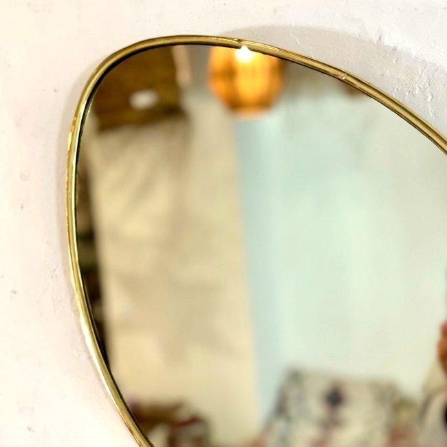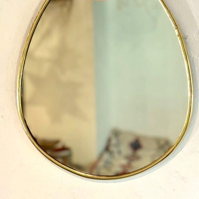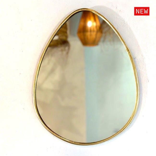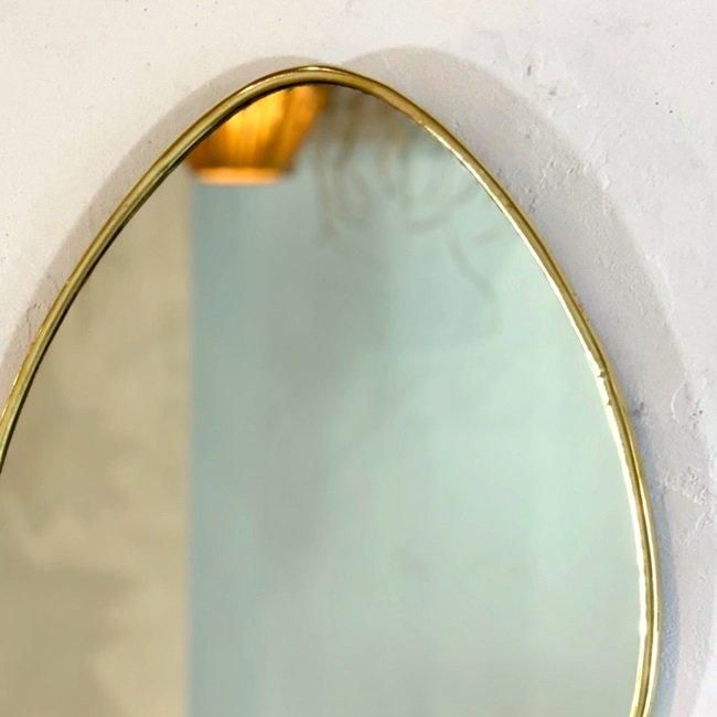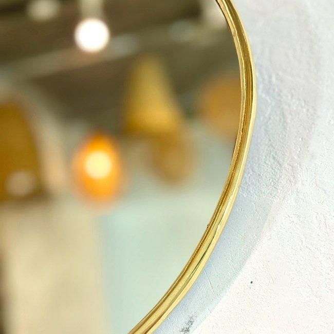 ゴールドの細い真鍮フレームと楕円の鏡面が特徴の、スタイリッシュな壁掛けミラーです。